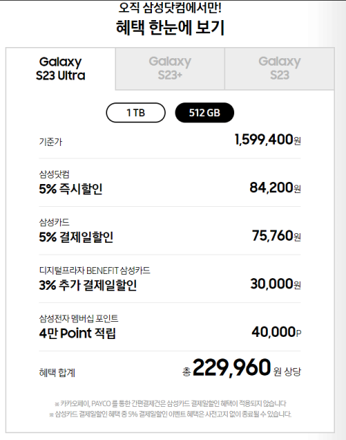 현재 23년 2월 9일 기준으로갤럭시 S23 울트라의 경우 약 23만 원정도의 혜택을 받을 수 있습니다.