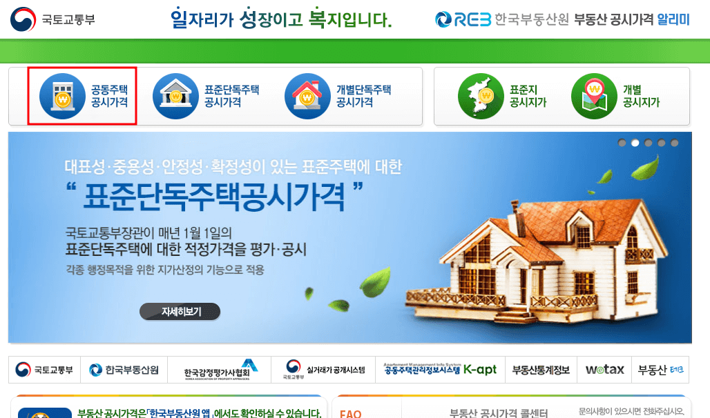 왼쪽 상단에 공동주택 공시가격을 선택합니다.