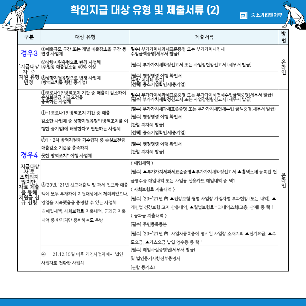 확인지급 대상자도 크게 몇몇 종류로 나뉘는데요. 해당 경우에 따라 필요 서류도 달라지니 본인이 확인지급 대상이 되는 자영업자나 소상공인이라면 어떠한 종류인지 먼저 알아봐야 합니다. 아래와 같이 소상공인 손실보전금 확인지급 대상자는 크게 4가지 경우로 나눌 수 있습니다.