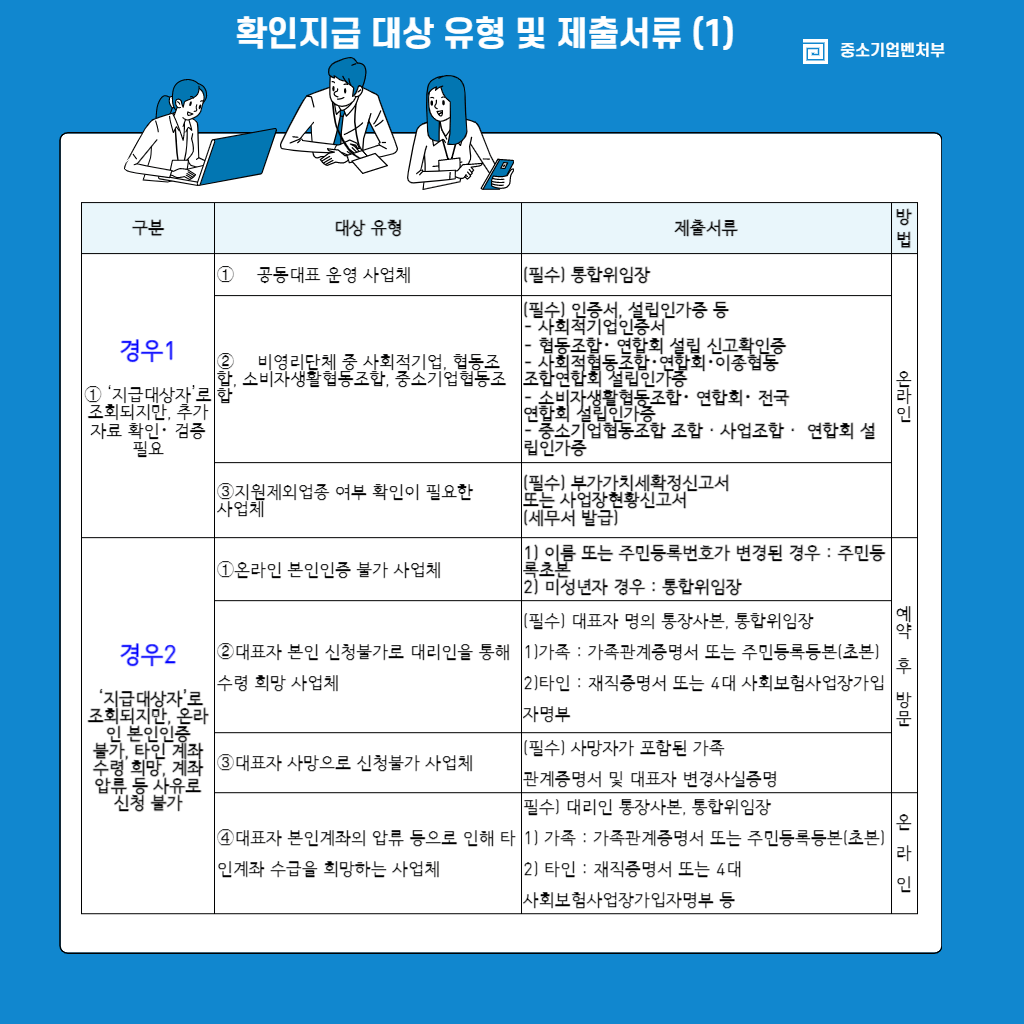 확인지급 대상 유형은 크게 위와 같이 분류되고 위 4가지 경우에서도 좀 더 세분화되어 나뉘어 있고 이에 따라 준비해야 하는 제출 서류가 달라집니다. 세분화된 대상 유형과 필요서류는 아래 이미지를 확인해주세요.